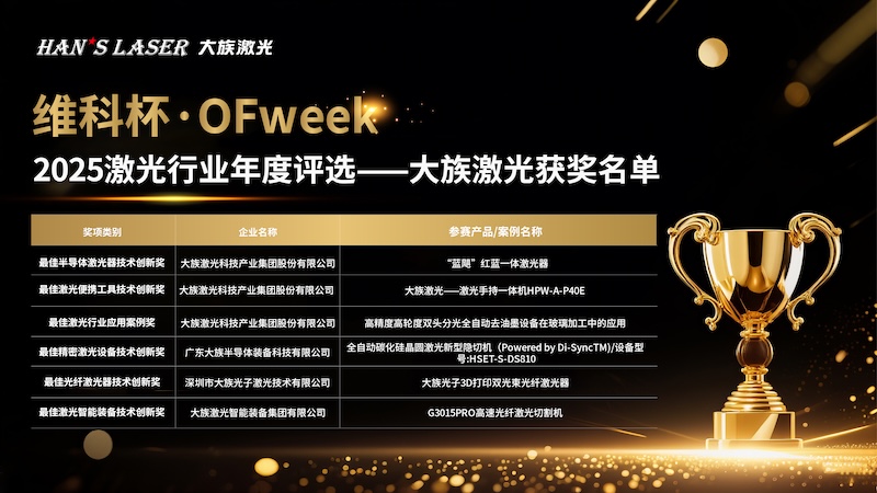 7月31日,备受瞩目的“维科杯·OFweek 2025激光行业年度评选”颁奖典礼于深圳福田会展中心顺利举行,来自获奖企业高层代表、评委团代表及行业媒体代表等齐聚现场,共同见证这一荣耀时刻。大族激光凭借深厚的技术积累、品牌影响力和市场稳健表现等,一举斩获多项重磅荣誉;同时,大族激光旗下多家子公司也摘得荣誉。